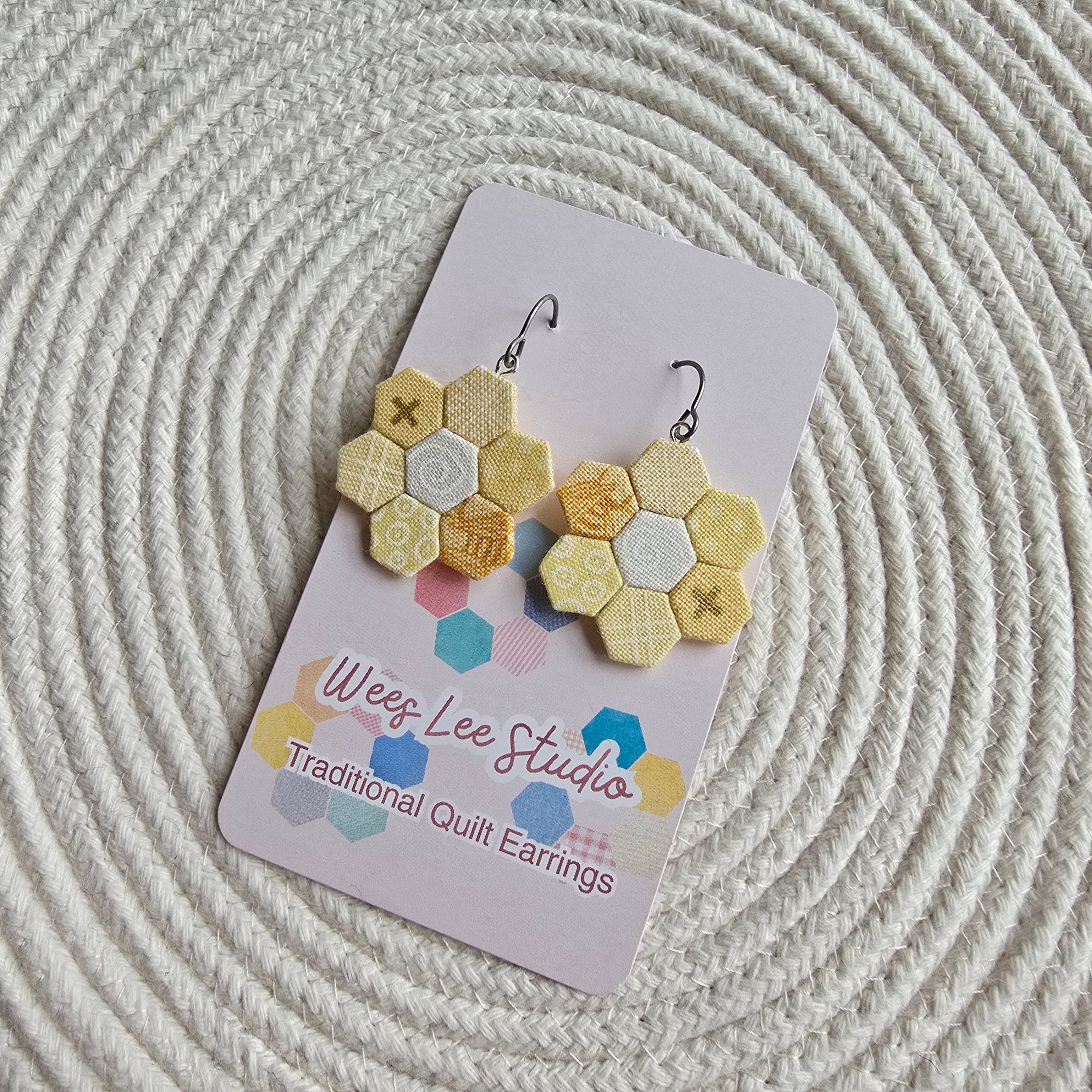 Check out these hexagon earrings that are handsewn using traditional English Paper Piecing quilting techniques.